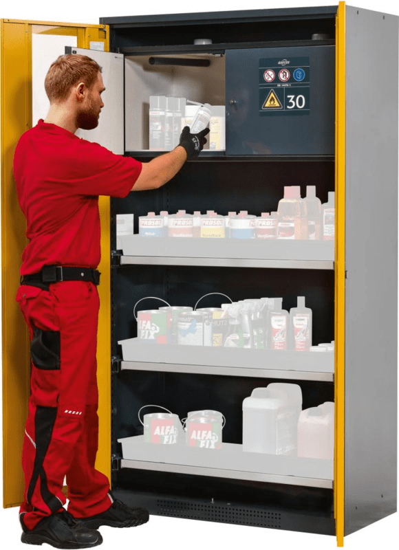 Chemikalienschrank, mit Tablarauszüge und Sicherheitsbox • Korpus: Feinstahlblech mit robuster, hochwertiger Strukturlackierung, RAL 7016 anthrazitgrau • Türen: abschließbar mit einem im Drehgriff integrierten Zylinderschloss, RAL 1004 sicherheitsgelb • Stellfüße: integriert, einfach auszurichten • Belüftung: Lüftungsöffnungen im Bodenbereich • Tablarauszüge: inklusive robuster PP-Auffangwanne mit allgemeiner bauaufsichtlicher Zulassung (DIBt) • Typ 30-Sicherheitsbox: Zugelassen für die Lagerung entzündbarer Flüssigkeiten, Spraydosen etc, Feuerwiderstandsfähigkeit 30 Minuten (typgeprüft), GS-geprüft Lieferung: Schrank mit 3 Tablarauszüge mit PP-Auffangwanne, Typ-30-Sicherheitsbox. Hinweis: Für die vorschriftsmäßige Lagerung nicht entzündbarer Chemikalien und Giftstoffe in Arbeitsräumen (gemäß TRGS 510, DGUV-I 213-850 und Gefahrstoffverordnung).