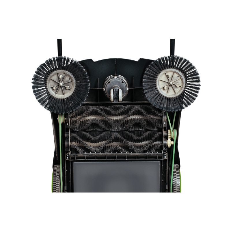 Zwei Seitenbesen fegen das Kehrgut vor die Tandem-Kehrwalzen, diese befördern es von oben in den Kehrgutbehälter