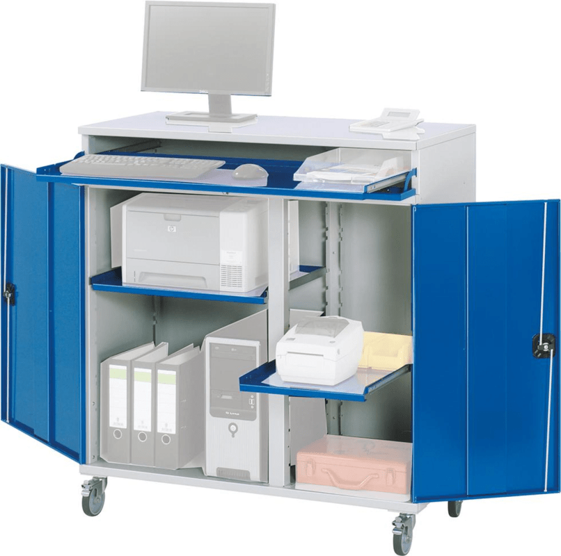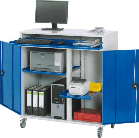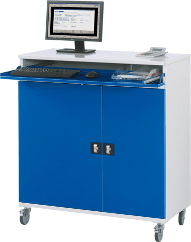 Computer-Schrank, mobil • Abschließbare Tastaturklappe mit Tastaturauszug • Unterbau: mit abschließbarer Flügeltür, Einbauelemente ausziehbar, Tragkraft 20 kg, Auszug 80 % und in der Einbauhöhe verstellbar • 4 Lenkrollen, davon 2 mit Feststeller, Rollen-Ø 100 mm • Kabeldurchlässe: Deckel, Rückwand, Innenteil • Umweltfreundliche Pulverbeschichtung: RAL 7035 lichtgrau, RAL 5010 enzianblau Lieferung: Komplett montiert.