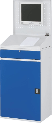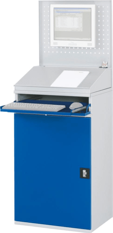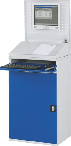 Computer-Schrank, stationär, mit Lochplatte • Abschließbare Tastaturklappe mit Tastaturauszug • Lochplatte mit 4-kant-Systemlochung und Bohrbild für Bildschirmmontage • Schreibaufsatz mit Klappdeckel