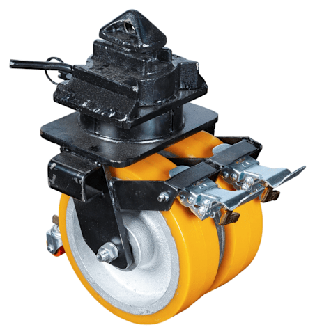 Containerrollen-Satz bestehend aus 4 Lenkrollen mit Feststeller. Mit Drehverschluss für ISO 1161-Eckbeschläge. Räder Gusskern und PU-Lauffläche. Tragfähigkeit Einzelrolle: 5000 kg; Tragfähigkeit kompletter Satz: 15000 kg dynamisch bei 6 km/h, 20000 kg statisch. Maximale Geschwindigkeit: 6 km/h
