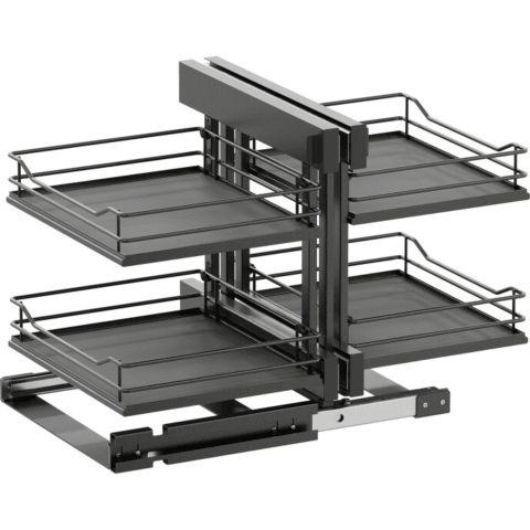 Auch der größte Stauraum nützt wenig, wenn er nicht erreichbar ist. Deshalb ermöglicht diese Systemlösung den vollen Zugriff auf den Schrankinhalt und verwandelt jede Ecke in einen funktionalen Raum. Die Montage erfolgt seitenunabhängig: Der Rahmen wird auf dem Boden des Eckschrankes montiert