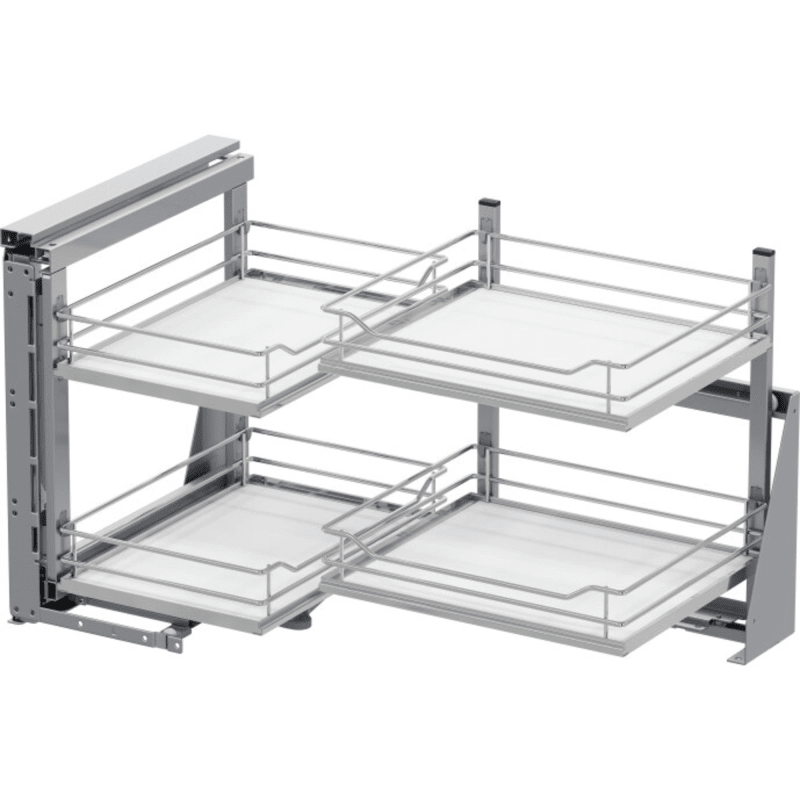 Egal, was Sie im Eckschrank verstaut haben – mit dieser Lösung erreichen Sie es problemlos. Beim Öffnen schwenken die vorderen Körbe fließend heraus und erleichtern den Zugriff auf die hinteren Körbe, die sich automatisch in den vorderen Korpusteil bewegen. Die integrierte Dämpfung mit Selbsteinzug sorgt für ein lautloses Schließen.