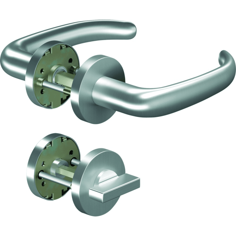 OGRO Drücker-Halbgarnitur CORE 8999; Material: Aluminium; Befestigungsart: verdeckt verschraubt; Abdeckung: mit Rosetten; Benutzerklasse: Klasse 4; Stärke Abdeckung: 9 mm; Einsatzbereich: Objekttür; Basis: Drücker-Halbgarnitur; Lochung: WC-Vierkant; Vierkant: 8 mm; Befestigungssystem: Stiftverbindung; DIN-Richtung: DIN Links-Rechts; Lagerung: festdrehbar,Gleitlager; Farbe: silber; Oberfläche: satino; Farbton: naturfarbig; Norm: DIN EN 1906; Türart: Innentüren; Drückerbefestigung: Vollstift; Anschlagrichtung: Drücker rechts/links verwendbar; Türwerkstoff: Holz; Drückerform: gebogen