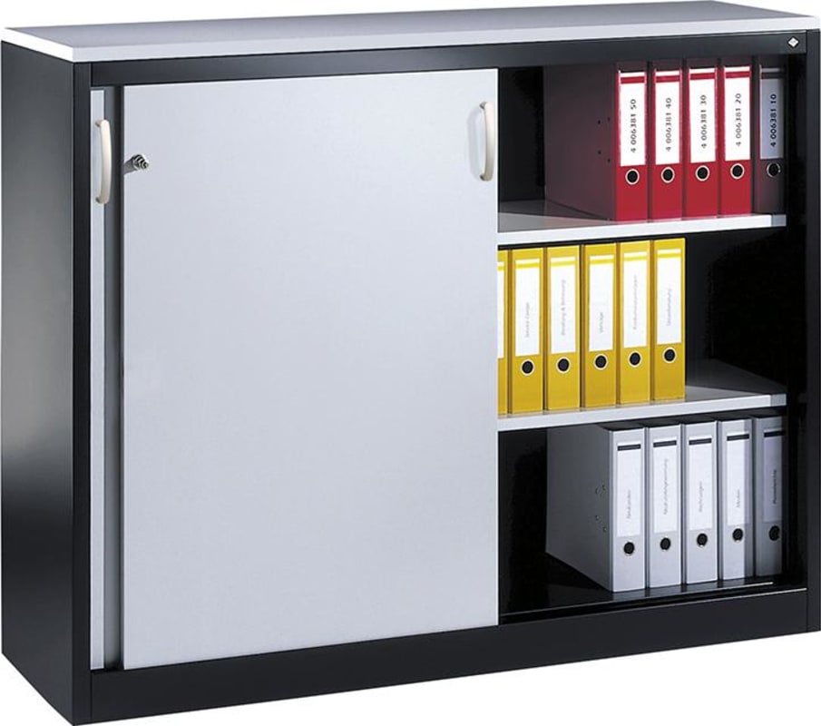 Schiebetürenschrank• Gehäuse: Stahlblechkonstruktion mit hochwertiger Einbrennbeschichtung in RAL 7035 lichtgrau • Schiebetüren: leichtgängig laufend, mit Spezial-Laufrollen • Dreh-Druckzylindersch
