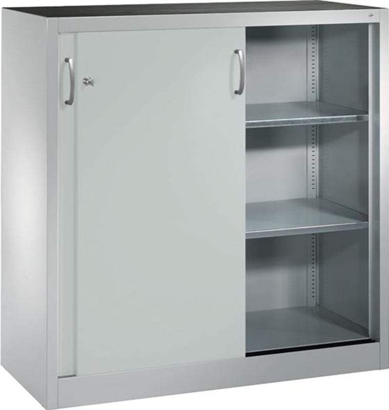 Schiebetüren-Beistellschrank, Höhe 1000 mm• Langlebige Stahlkonstruktion • Türen: rollengelagert und leichtgängig • Material: Stahlblech mit hochwertiger Einbrennbeschichtung • Mit Gummiriefenmatte