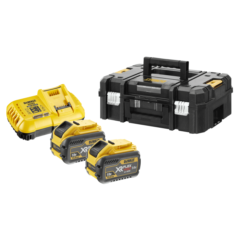 XR FLEXVOLT Akku 2er-Set in T STAK™-Box Lieferumfang: System-Schnellladegerät (DCB118), 2 x 54 Volt XR FLEXVOLT Akkus / je 216 Wh (DCB548), T STAK™-Box II, Akku-Trage (DCK998