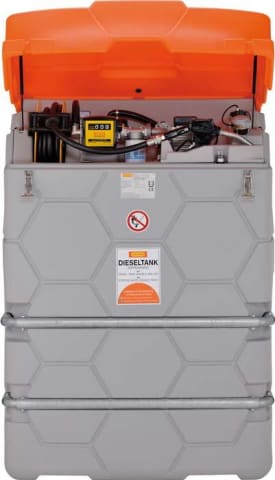 Dieseltankanlage CUBE Outdoor Premium • Behälter: PE, doppelwandig, Stabilität durch Wabenstruktur und Stahlbandagen • Klappdeckel: mit Gasfeder • PE-Auffangwanne: integriert • Optische Leckage-Anzei