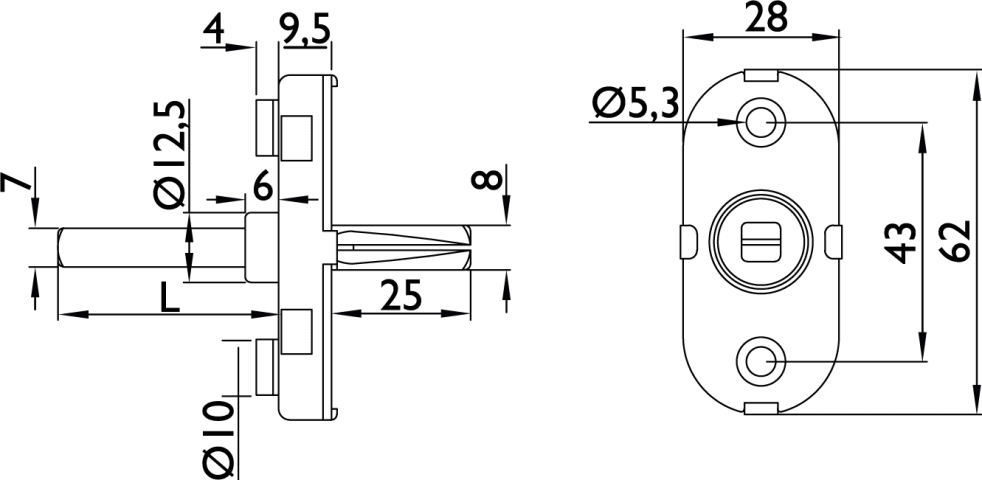 DK - Raster - Unterkonstruktion Zamak, Stift 7 x ca. 35 mm vorstehend, Stift für Griff 8 x 25 mm