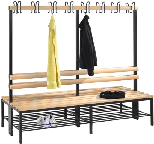 Doppelseitige Garderobenbank, Holzleisten • Sitzfläche aus Hartholz • Doppelseitig • Gestell: 4kant-Stahlrohr 30 x 30 mm, höhenverstellbare Kunststoff-Füße • Sitzfläche, Rückenlehnen, Hakenleisten: Hartholz-Leisten, gerundet, allseits gehobelt, klar lackiert, mit natürlichen Farbunterschieden • Hakenleisten: mit Kunststoff-Doppelkleiderhaken, verdeckt nach DIN • Auf Anfrage: Höhenverstellschrauben bis 50 mm • Lackierung: Gestell RAL 7021 schwarzgrau Lieferung: Komplett montiert.