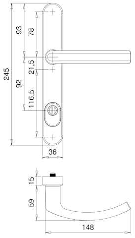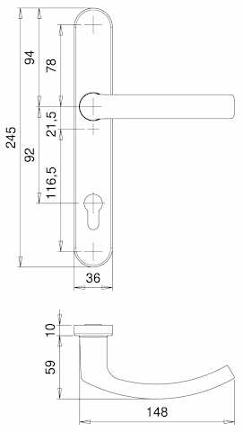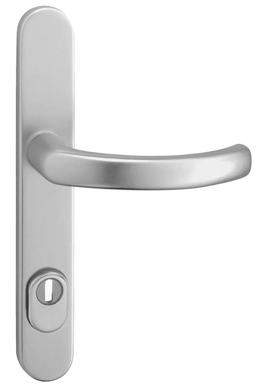 Rohrrahmen Sicherheits-Drückergarnitur Kronos 2005/0045,Langschild,mit Zylinderabdeckung 92/8,DIN Links-Rechts,stahlfarbig eloxiert,gebogen/gebogen