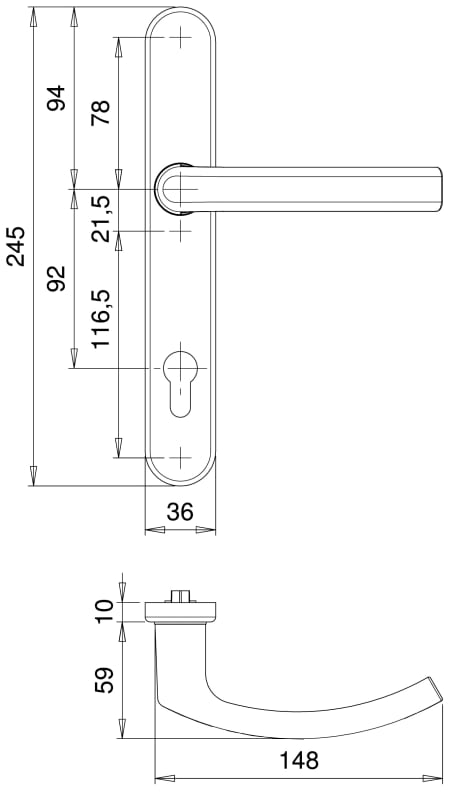 Dieckmann Alu-Rahmen-Drücker-Garnitur, Serie Kronos, 8mm VKT, 92 PZ, Alternativ-Bohrbild, 2005/035 F05