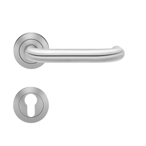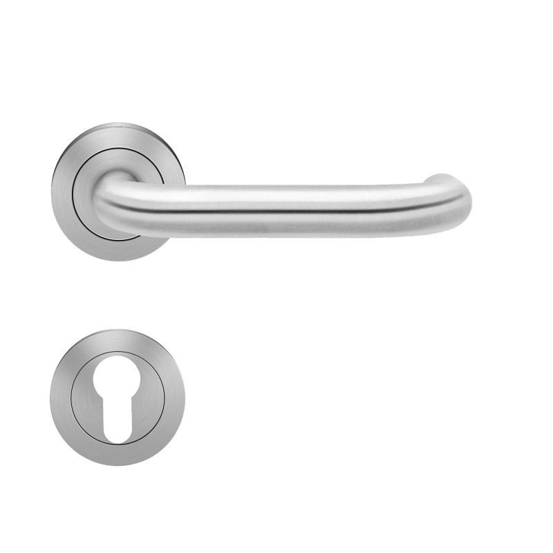 Drückergarnitur Kreta auf dreiteiliger, runder Rosette in Edelstahl matt, Profilzylinder, Feuerschutz geprüft nach DIN18273, Gebrauchskategorie 3 nach DIN/EN1906, festdrehbar gelagert