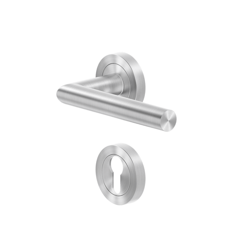 Drückergarnitur ER/FS 28V - Rhodos auf dreiteiliger, runder Rosette in Edelstahl matt, Profilzylinder, Feuerschutz geprüft nach DIN18273, Gebrauchskategorie 3 nach DIN/EN1906