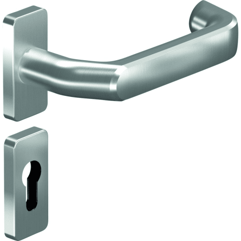 OGRO Drücker-Halbgarnitur 8116V/6620SR FS; Material: Edelstahl; Befestigungsart: verdeckt verschraubt; Befestigungstechnik: ohne Stütznocken; Abdeckung: mit Rosetten; Form: oval; Benutzerklasse: Klasse 4; Stärke Abdeckung: 9 mm; Einsatzbereich: Feuerhemmend; Basis: Drücker-Halbgarnitur; Lochung: Profilzylinder gelocht; Vierkant: 9 mm; Befestigungssystem: Stiftverbindung; Zulassung: für Rauchschutz,für Feuerschutz,für Notausgänge; DIN-Richtung: DIN Links-Rechts; Lagerung: Gleitlager,festdrehbar mit Hochhaltemechanik; Breite: 31 mm; Länge: 69 mm; Oberfläche: satino; Farbton: edelstahl; Norm: DIN 18273,DIN EN 179,DIN EN 1906; Türart: Außentüren,Rahmentüren,Fluchttüren; Drückerbefestigung: Vollstift; Anschlagrichtung: Drücker rechts/links verwendbar; Türwerkstoff: Aluminium,Kunststoff; Drückerhöhe: 67 mm; Drückerlänge: 156 mm; Drückerbreite: 23,5 mm; Technik: Click&Go Technik; Drückerform: gekröpft,gebogen
