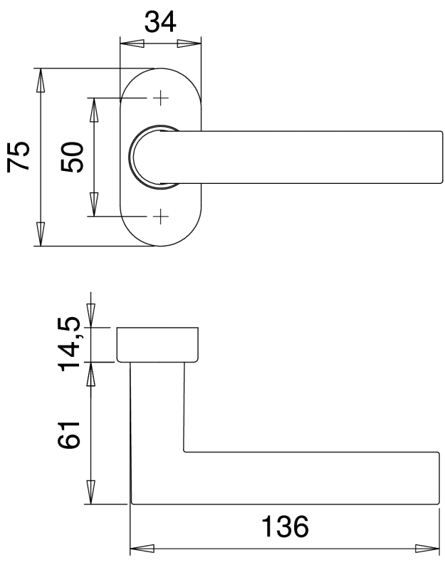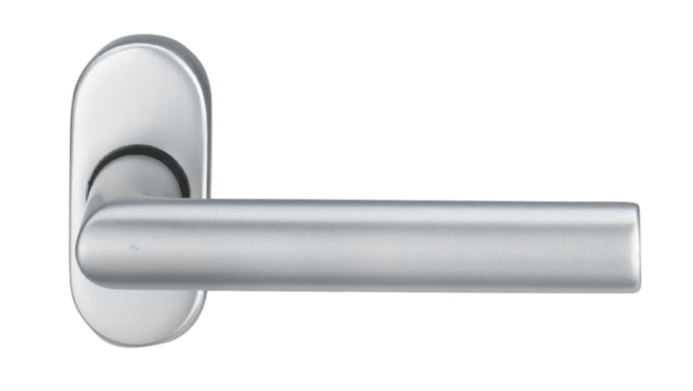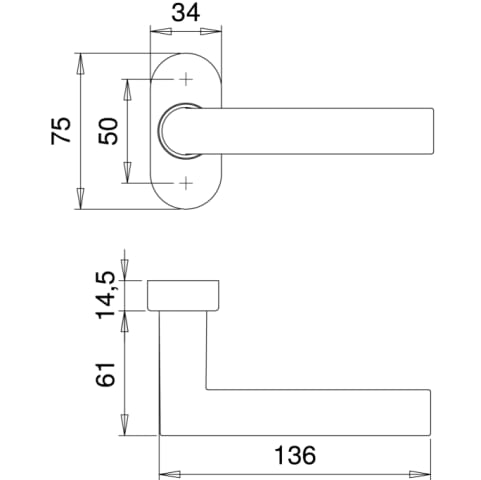 Rahmen-Rosettendrücker aus Edelstahl. • festdrehbar gelagert mit Rückholmechanik • rechts / links verwendbar • Clip-Deckrosette auf Stahl-Grundkonstruktion • einliegende Kunststoffrasten • verdeckte