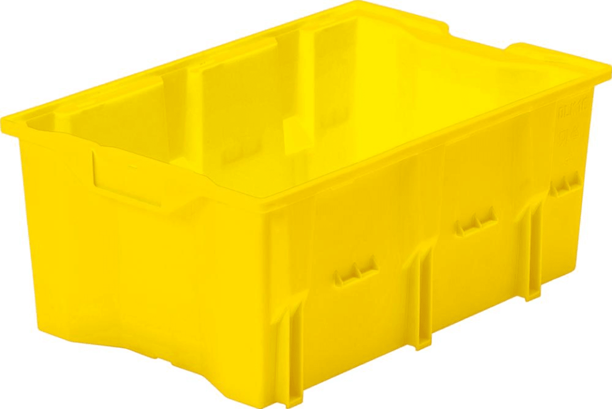 Drehstapelbehälter DLK 1c • Material: hochwertiges Polyethylen • Lebensmittelecht • Standard-Ausführung mit glattem Boden • Gefüllt aufeinander, leer ineinander stapelbar durch 180°-Drehung • Halteru