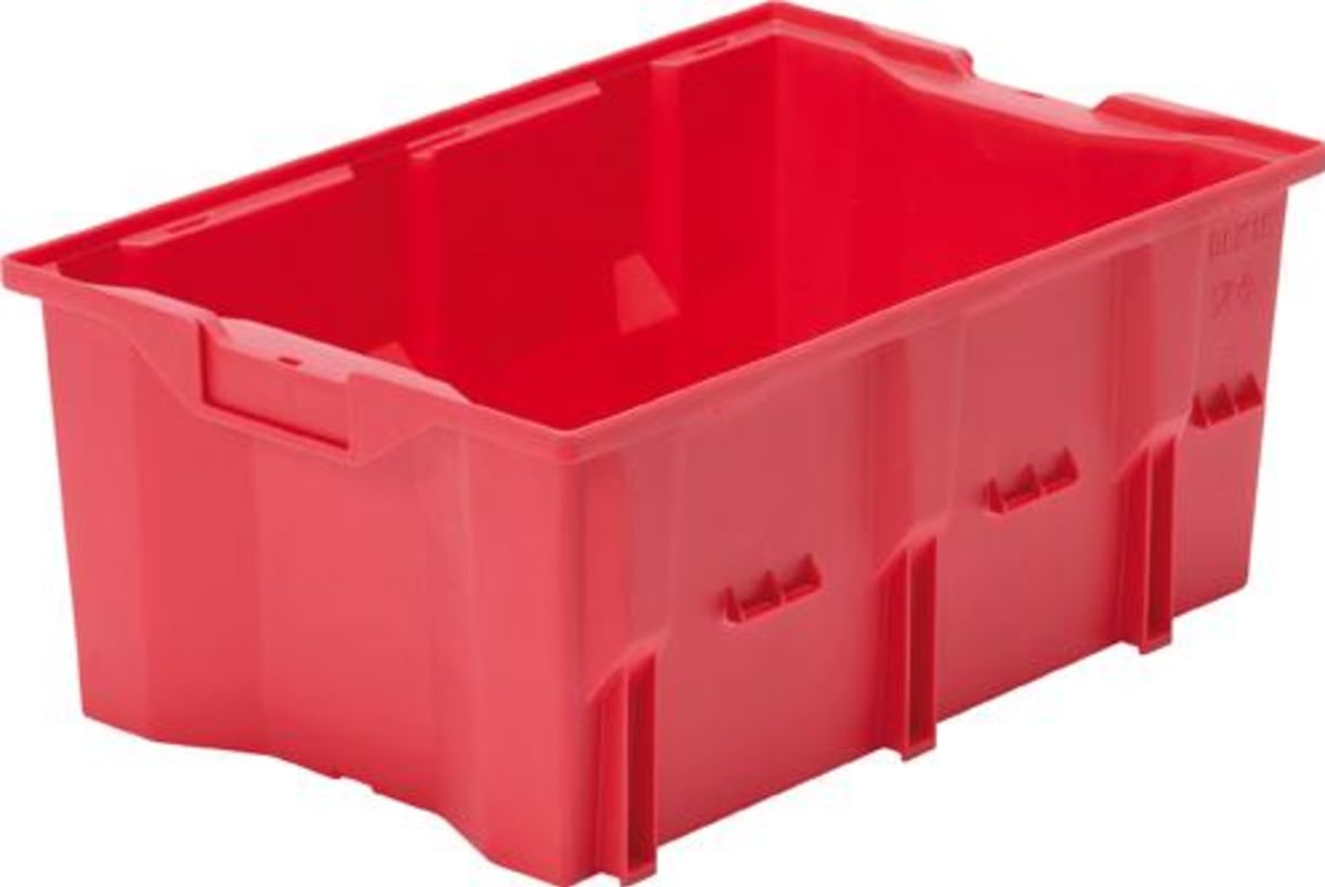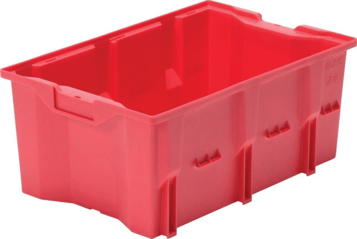 Drehstapelbehälter DLK 1c • Material: hochwertiges Polyethylen • Lebensmittelecht • Standard-Ausführung mit glattem Boden • Gefüllt aufeinander, leer ineinander stapelbar durch 180°-Drehung • Halteru