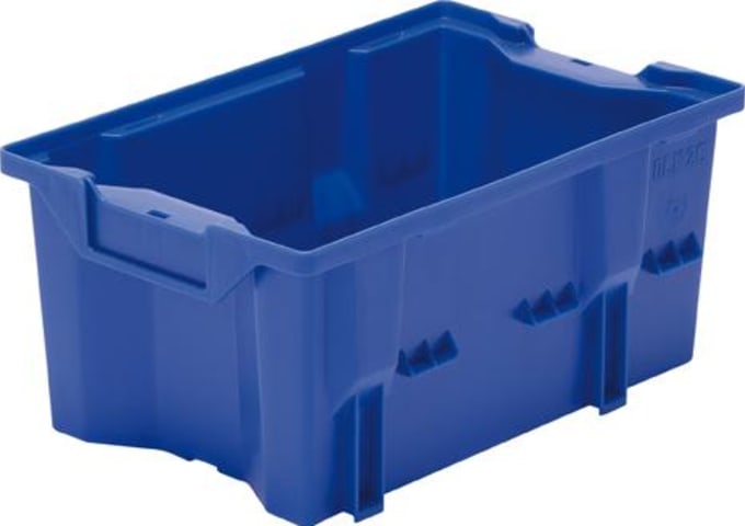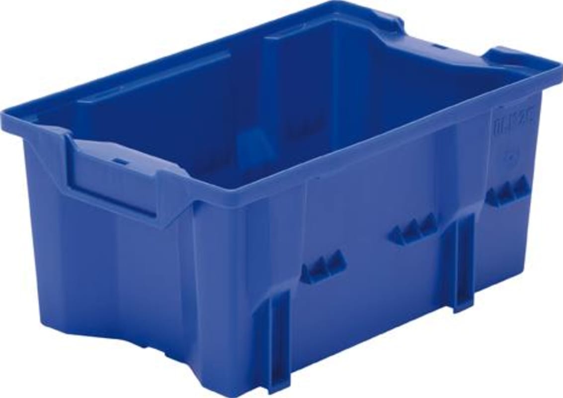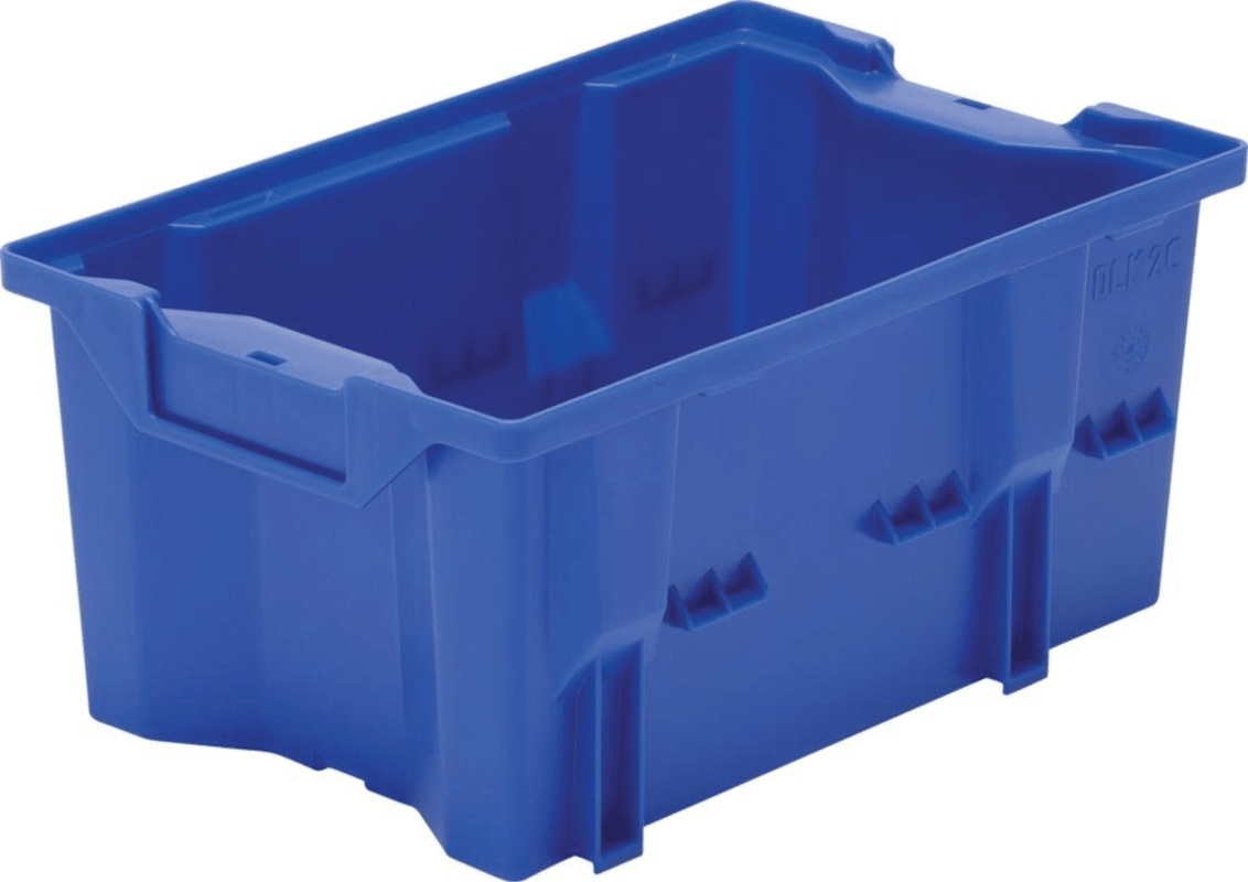 Drehstapelbehälter DLK 2c • Material: hochwertiges Polyethylen • Lebensmittelecht • Standard-Ausführung mit glattem Boden • Gefüllt aufeinander, leer ineinander stapelbar durch 180°-Drehung • Halteru