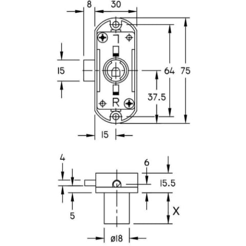 Drehstangenschloss zum anschrauben, links-rechts umstellbar, für geteilte Stangen 6/5 mm. Vorgerichtet für Plattenstärken bis 22 mm. Innenzylinder und Zubehör, sind separat zu bestellen.