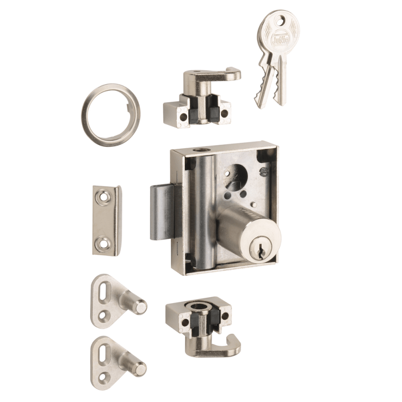 JUNIE, Möbel-Zylinderdrehstangenschloss-Set, Modellnummer: 7020, Ausführung: aufliegend, Ergänzung: mit Rosette, Dornmaß: 30 mm, Werkstoff: Stahl, Oberfläche: vernickelt, Material Zylinder: Messing, Oberfläche Zylinderkörper: matt vernickelt, Material Rosette: Messing, Befestigungsart: zum Anschrauben, Bohrdurchmesser: 24 mm, für Stangendurchmesser: 8x7 mm, Anschlagrichtung: rechts, Schließbewegung: 360 °, Schließtechnik: Stiftzylinder, Schließfunktion: gleichschließend, Schließungsnummer: BN 0106, Anzahl Schlüssel: 2 St., Anzahl Zuhaltungen: bis zu 6 St., Zylinderdurchmesser: 22 mm, Zylinderlänge: 20,5 mm, Riegelhöhe: 26 mm, Riegeltiefe: 4,8 mm, Schlosskastenbreite: 50 mm, Schlosskastenhöhe: 57,5 mm, Schlosskastentiefe: 16 mm, Zusatzinformation: für geteilte Stangen
