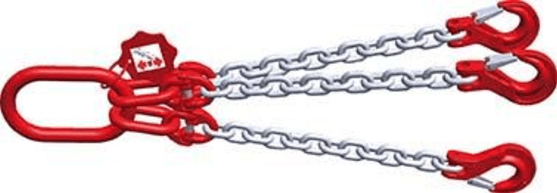 Dreistrang-Kettengehänge, verzinkte Kette • Kettengehänge mit drei Strängen und drei Gabelkopf-Lasthaken • Nutzlänge: 1000 mm • Geprüfte Sicherheit: H-Stempel, gemäß DIN EN 818-4, Güteklasse 8