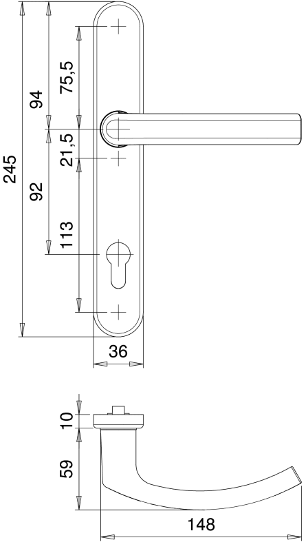 EDI, Profiltür-Drückergarnitur, Abdeckung: Langschild, Lochung: Profilzylinder gelocht, Entfernung: 92mm, Vierkant: 8mm, Material: Aluminium, Farbe: weiß, Farbton: verkehrsweiß, Oberfläche: lackiert,