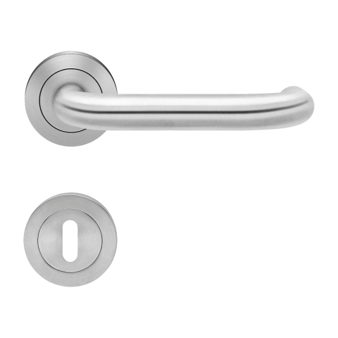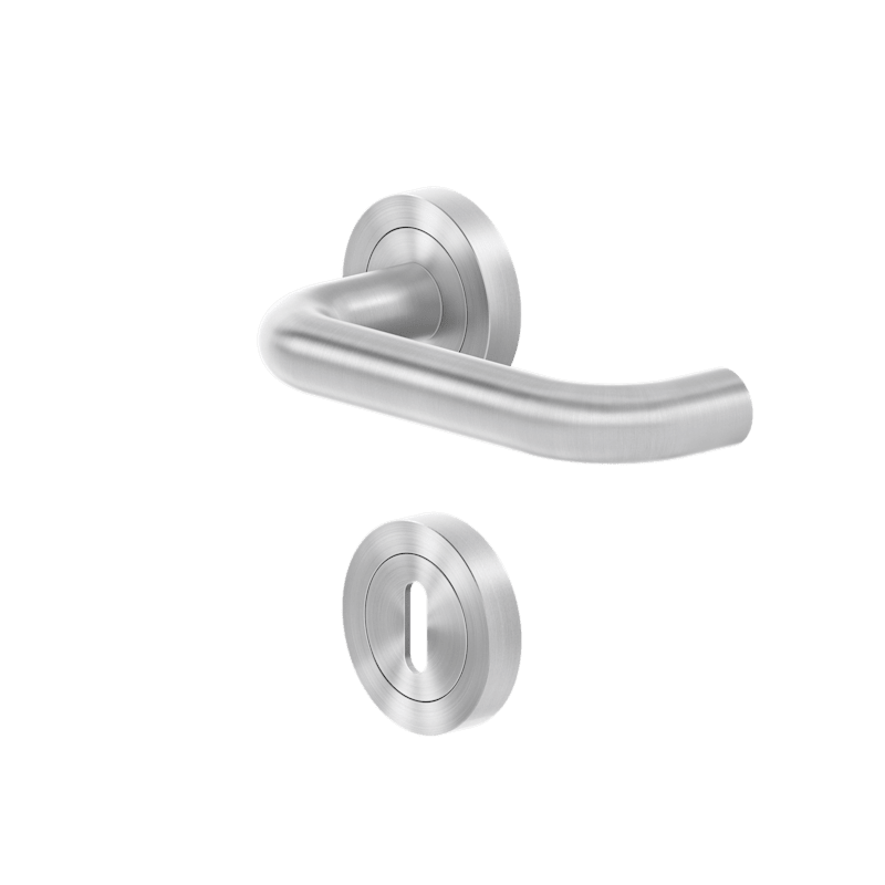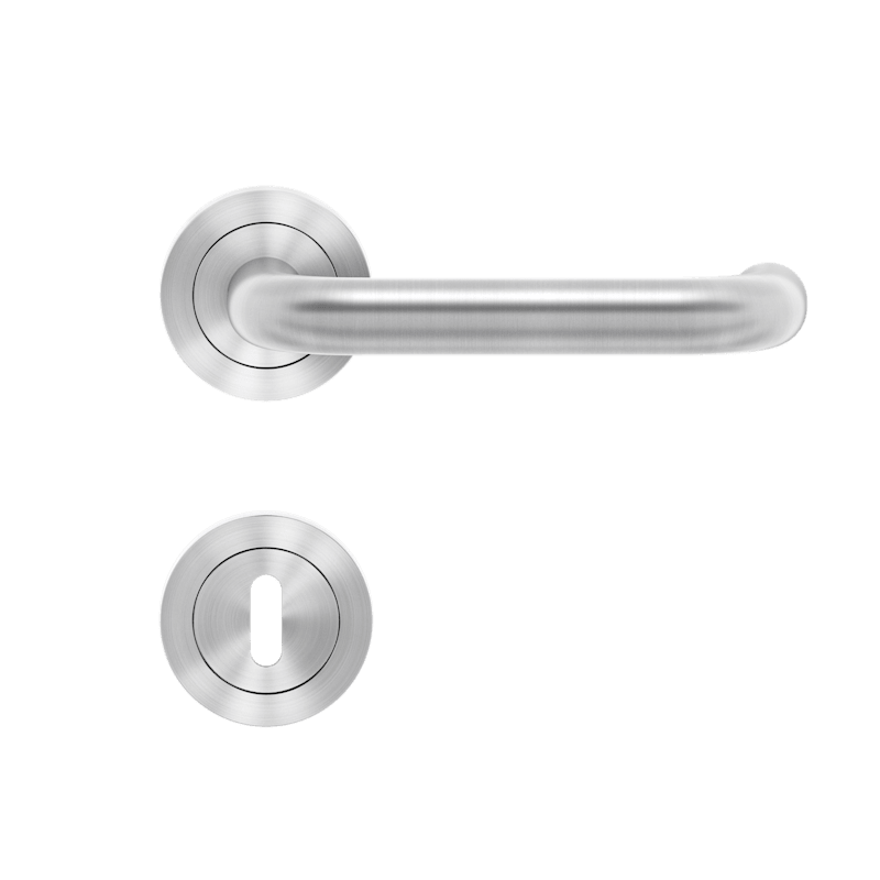 Drückergarnitur mit Türdrückermodell ER27 Kreta, für Standardtüren nach DIN EN 1906, Benutzungskategorie 3. Eigenschaften: • 3-teiliger Schraubrosetten kantig • Gleitlager aus Nylon • fest drehbar g