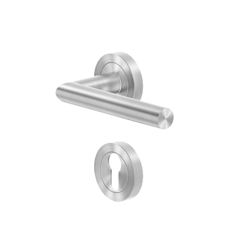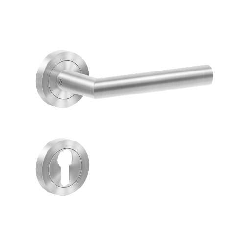 Drückergarnitur Rhodos mit 3-teiliger Schraubrosette EZ1332 und Hochhaltefeder. Geprüft nach DIN EN 1906 Gebrauchskategorie GK3. Gleitlager aus Nylon, fest drehbar gelagert mit Hochhaltefeder, durchge