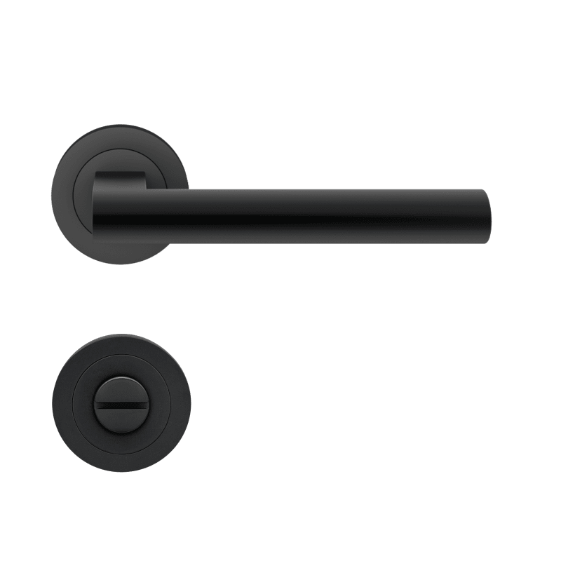 Drückergarnitur ER45 - Madeira auf dreiteiliger, runder Rosette in Kosmos Schwarz, Buntbart, Gebrauchskategorie 3 nach DIN/EN1906
