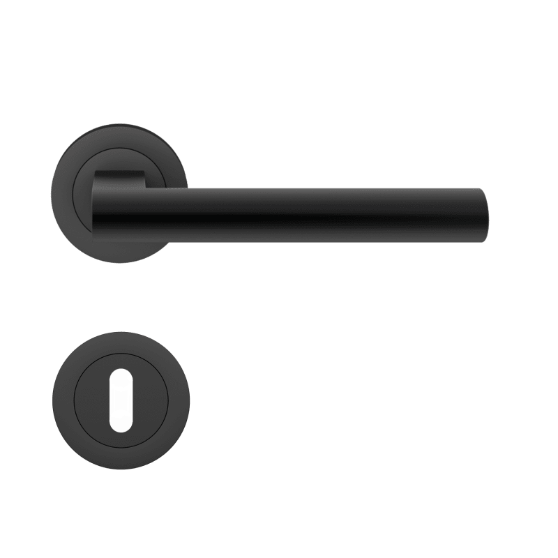 Drückergarnitur ER45 - Madeira auf dreiteiliger, runder Rosette in Kosmos Schwarz, Buntbart, Gebrauchskategorie 3 nach DIN/EN1906