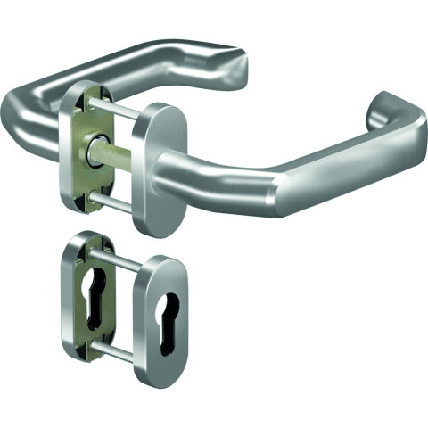 OGRO Drückergarnitur 8116V/6611SR FS; Produkttyp: Drückergarnitur; Produkttyp (Hersteller): Drückergarnitur; Ausführung: Rosette; Befestigungsart Drückerrosette (außen): verdeckt verschraubt; Befestigungsart Drückerrosette (innen): verdeckt verschraubt; Befestigungsart Schlüsselrosette (außen): verdeckt verschraubt; Befestigungsart Schlüsselrosette (innen): verdeckt verschraubt; Befestigungstechnik: ohne Stütznocken; Montageart: aufliegend; Form Drückerrosette: eckig; Form Schlüsselrosette (außen): eckig; Form Schlüsselrosette (innen): eckig; Vierkant: 9 mm; Material: Aluminium; Form Türgriff (innen): gekröpft,gebogen; Form Türgriff (außen): gekröpft,gebogen; Breite Türgriff (innen): 23,5 mm; Breite Türgriff (außen): 23,5 mm; Länge Türgriff (innen): 156 mm; Länge Türgriff (außen): 156 mm; Höhe Türgriff (innen): 67 mm; Höhe Türgriff (außen): 67 mm; Breite Drückerrosette (außen): 31,5 mm; Breite Drückerrosette (innen): 31,5 mm; Länge Drückerrosette (außen): 68,5 mm; Länge Drückerrosette (innen): 68,5 mm; Höhe Drückerrosette (außen): 9 mm; Höhe Drückerrosette (innen): 9 mm; Breite Schlüsselrosette (außen): 31,5 mm; Breite Schlüsselrosette (innen): 31,5 mm; Länge Schlüsselrosette (außen): 68,5 mm; Länge Schlüsselrosette (innen): 68,5 mm; Höhe Schlüsselrosette (außen): 9 mm; Höhe Schlüsselrosette (innen): 9 mm; Lagerung: festdrehbar,mit Rückholfeder; Einsatzbereich: Objekttür; Türart: Rohrrahmen; Türwerkstoff: Aluminium,Kunststoff; Anwendung: außen/innen; Lochung: Profilzylinder gelocht; DIN-Richtung: DIN Links-Rechts; Farbe: silber; Farbton: naturfarben; Oberfläche: satino; Technik: Click&Go Technik; Ausführung Vierkant: Vierkantstift; Türstärke min.: 35 mm; Türstärke max.: 48 mm; Norm: DIN EN 179,DIN EN 1906,DIN 18273; Zulassung: für Feuerschutz,für Rauchschutz,für Fluchttüren