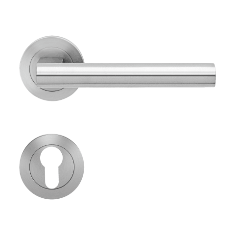 Drückergarnitur mit Türdrückermodell ER45 Madeira, für Standardtüren nach DIN EN 1906. Eigenschaften: • 3-teiliger Schraubrosette kantig • Gleitlager aus Nylon • fest drehbar gelagert mit Hochhaltefe