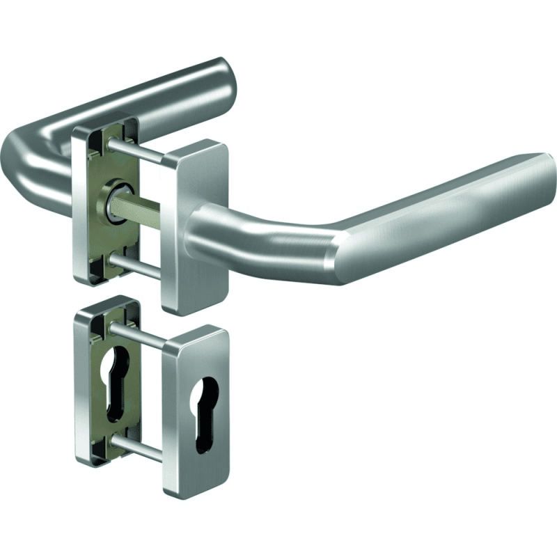 OGRO Drückergarnitur 8115V/6621SR FS; Produkttyp: Drückergarnitur; Produkttyp (Hersteller): Drückergarnitur; Ausführung: Rosette; Befestigungsart Drückerrosette (außen): verdeckt verschraubt; Befestigungsart Drückerrosette (innen): verdeckt verschraubt; Befestigungsart Schlüsselrosette (außen): verdeckt verschraubt; Befestigungsart Schlüsselrosette (innen): verdeckt verschraubt; Befestigungstechnik: ohne Stütznocken; Montageart: aufliegend; Form Drückerrosette: oval; Form Schlüsselrosette (außen): oval; Form Schlüsselrosette (innen): oval; Vierkant: 9 mm; Material: Aluminium; Form Türgriff (innen): gekröpft; Form Türgriff (außen): gekröpft; Breite Türgriff (innen): 23,5 mm; Breite Türgriff (außen): 23,5 mm; Länge Türgriff (innen): 155 mm; Länge Türgriff (außen): 155 mm; Höhe Türgriff (innen): 67 mm; Höhe Türgriff (außen): 67 mm; Breite Drückerrosette (außen): 31,5 mm; Breite Drückerrosette (innen): 31,5 mm; Länge Drückerrosette (außen): 68,5 mm; Länge Drückerrosette (innen): 68,5 mm; Höhe Drückerrosette (außen): 9 mm; Höhe Drückerrosette (innen): 9 mm; Breite Schlüsselrosette (außen): 31,5 mm; Breite Schlüsselrosette (innen): 31,5 mm; Länge Schlüsselrosette (außen): 68,5 mm; Länge Schlüsselrosette (innen): 68,5 mm; Höhe Schlüsselrosette (außen): 9 mm; Höhe Schlüsselrosette (innen): 9 mm; Lagerung: festdrehbar,mit Rückholfeder; Einsatzbereich: Objekttür; Türart: Rohrrahmen; Türwerkstoff: Aluminium,Kunststoff; Anwendung: außen/innen; Lochung: Profilzylinder gelocht; DIN-Richtung: DIN Links-Rechts; Farbe: silber; Farbton: naturfarben; Oberfläche: satino; Technik: Click&Go Technik; Ausführung Vierkant: Vierkantstift; Türstärke min.: 35 mm; Türstärke max.: 48 mm; Norm: DIN EN 1906,DIN 18273; Zulassung: für Feuerschutz,für Rauchschutz
