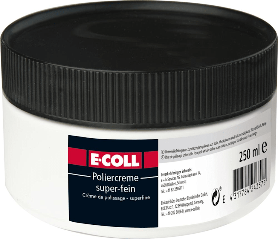 Poliercreme, super-fein• Polierpaste, universell • Wasserlöslich, silikonfrei • Schleifmittel Aluminiumoxid • Zum Hochglanzpolieren von Stahl, Buntmetall, Leichtmetall, Acryl und Messing
