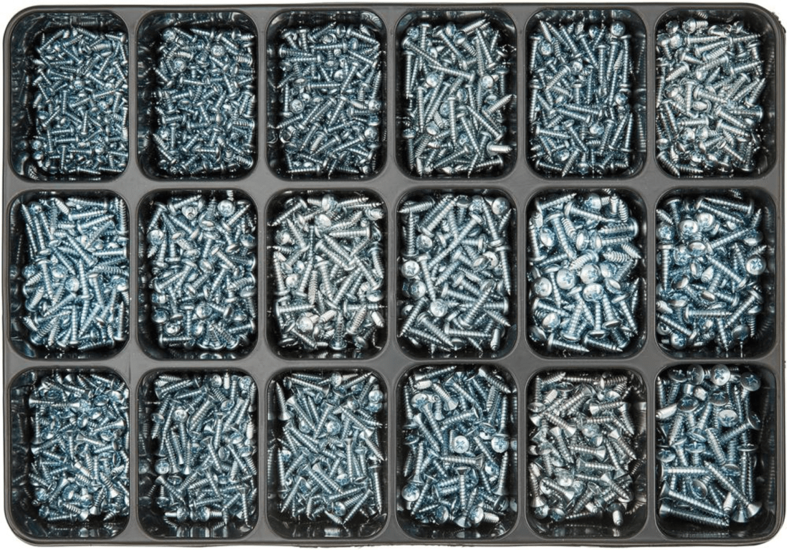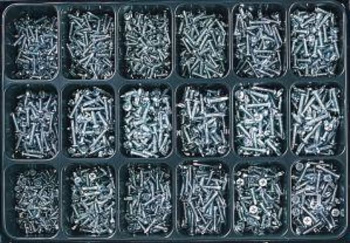 Blechschrauben-Sortiment, verzinkt Sortiment Nr. 10 • 2530-teiliges Blechschrauben-Sortiment: Linsenkopf, Kreuzschlitz H, Form C mit Spitze, DIN 7981 und Linsensenkkopf, Kreuzschlitz H, DIN 7983 Li