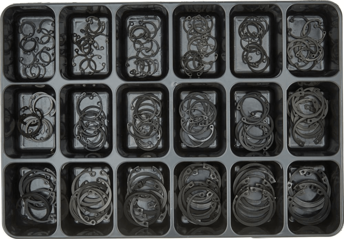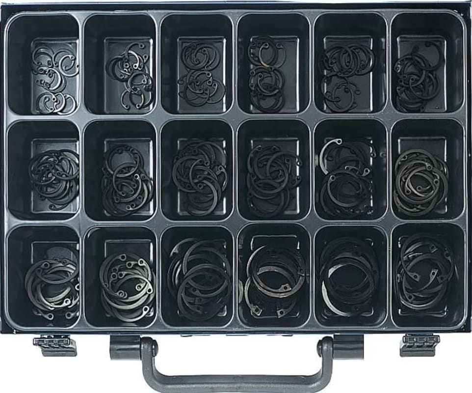 Sicherungsringe-Sortiment, DIN 472, geschwärzt Sortiment Nr. 18 • 180-teiliges Sicherungsringe-Sortiment , DIN 472 Lieferung: Im stabilen Stahlblechkoffer. Bohrungs-Ø mm x Stärke mm: 15 x 1,0 16