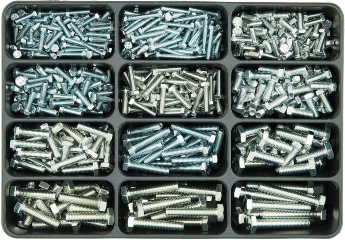 6-kant-Schrauben-Sortiment, DIN 933-8.8, verzinkt Sortiment Nr. 25. • 620-teiliges 6-kant-Schrauben-Sortiment, DIN 933-8.8 Lieferung: Im stabilen Stahlblechkoffer. Gewinde x Länge mm: M5 x 20 M5 x 30 M6 x 16 M6 x 20 M6 x 25 M8 x 20 M8 x 30 M8 x 40 M10 x 30 M10 x 40 M10 x 50 M10 x 60