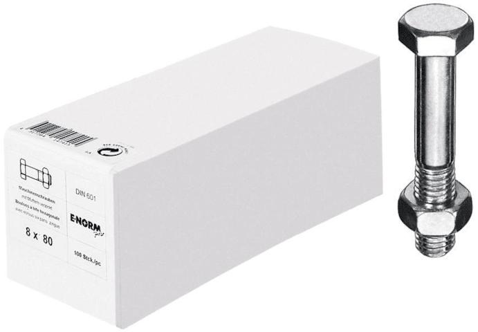 Meesenburg Artikelbezeichnung: E-NORMPRO 6-KT.-SCHRAUBEN DIN 601 M. MUTTER GVZ M 10X130 HP MASCHINENSCHRAUBE