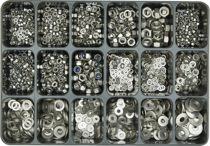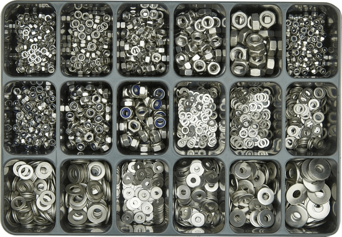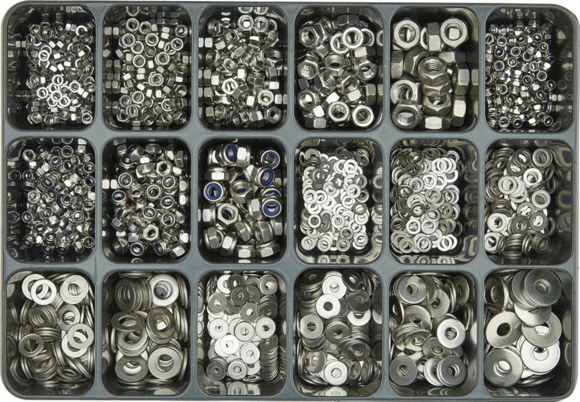 • 1525-teiliges Edelstahl A2-Sortiment: Muttern, DIN 934; Sicherungsmuttern, DIN 985 und Scheiben, DIN 125 + DIN 9021