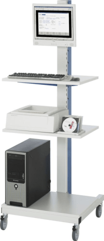 Computer-Ständer, mobil • Zentralsäule mit Systemlochraster: Verstellung der Einbauhöhe der Anbauelemente • 4 Lenkrollen, davon 2 mit Feststeller, Rollen-Ø 100 mm • Kabelkanal mit Klappdeckel: verti