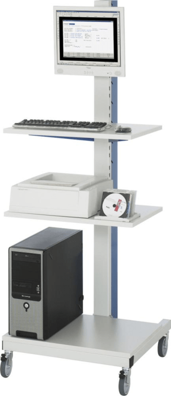 Computer-Ständer, mobil • Zentralsäule mit Systemlochraster: Verstellung der Einbauhöhe der Anbauelemente • 4 Lenkrollen, davon 2 mit Feststeller, Rollen-Ø 100 mm • Kabelkanal mit Klappdeckel: vertikale Anordnung mit Energieleiste und Anschlusskabel, beidseitiges Schlitzraster für Kabelzugang • Ablagen: melaminharzbeschichtet mit Tragkonsolen, Flächenlast max. 15 kg • Umweltfreundliche Pulverbeschichtung: RAL 7035 lichtgrau und RAL 5010 enzianblau Lieferung: Zerlegt.