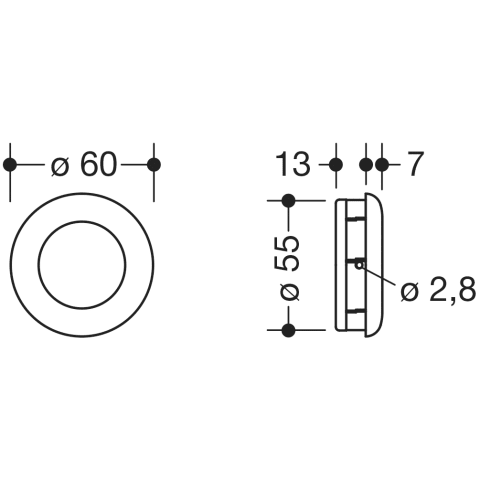 Einlassmuschel aus Polyamid, Einlassdurchmesser 55 mm, Einlasstiefe 13 mm, mit seitlichen Schraublöchern zur Befestigung. Lieferbar in den HEWI Farben.