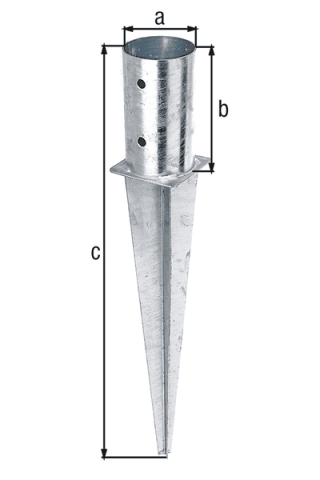 GAH Alberts Bodenhülse; Basis: Bodenhülse; Anwendungsbereich: Rundpfosten; Befestigungsart: zum Einschlagen; Material: Stahl; Oberfläche: feuerverzinkt; Anwendbare Materialien Auflager: Erde; Material aufzulagerndes Bauteil: Holz; Befestigung: Schrauben; Rohrdurchmesser: 81 mm; Höhe Pfostenaufnahme: 150 mm; Gesamtlänge: 600 mm; Anzahl Lochungen: 4 St.; Durchmesser Lochung: 11 mm