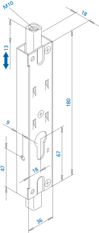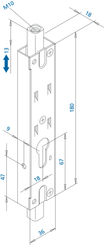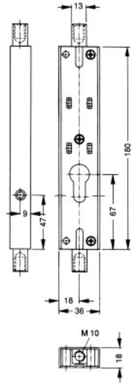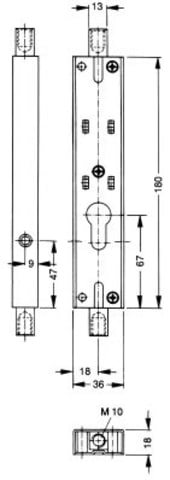 FUHR Treibriegelschloss 299PV; Produkttyp: Treibriegelschloss; Verriegelung: manuell; Entriegelung: manuell; Stulpform: ohne Stulp; Einsatzbereich: Standflügel; Schlosskastenhöhe: 180 mm; Türart: Rohrrahmen; Türflügelanzahl: zweiflügelig; Türwerkstoff: Aluminium; Hub Obenverriegelung: 13 mm; Hub Untenverriegelung: 13 mm; Dornmaß: 18 mm; Lochung: Profilzylinder gelocht; DIN-Richtung: DIN Links-Rechts; Einbautiefe Schlosskasten: 36 mm