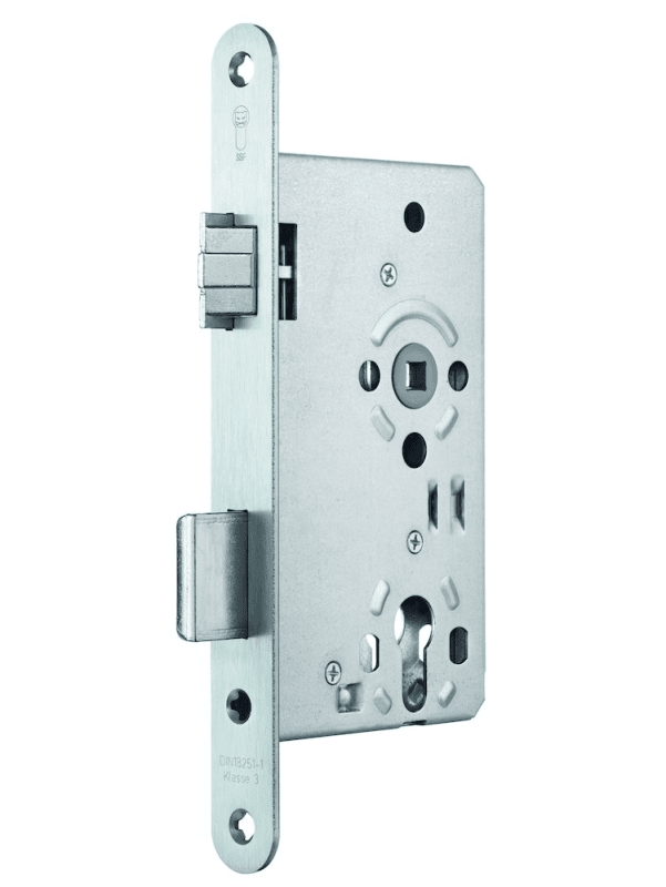 SSF, Objekttür-Objekt-Einsteckschloss, Lochung: WC gelocht, Dornmaß: 65 mm, Entfernung: 78 mm, Drückernussvierkant: 8 mm, Stulpbreite: 20 mm, Stulplänge: 235 mm, Stulpstärke: 3 mm, Stulpausführung: rund, Stulpeigenschaft: beidseitig überstehend, Modellnummer: 19, Wechsel: ohne Wechsel, DIN-Richtung: DIN Links, Einzelteilmaterial Stulp: Edelstahl, Farbton Stulp: edelstahl, Oberfläche Stulp: feingeschliffen, Türausprägung: Türe gefälzt, Schlossriegel: 1 tourig, Riegelausschluss: 10 mm, Riegeleigenschaft: Standard, Einzelteilmaterial Riegel: Stahl, Oberfläche Riegel: verzinkt, Schlossklasse: Klasse 3, Einzelteilmaterial Drückernuss: Stahl, Drückernuss: Klemmnuss, 3-teilig, Einzelteilmaterial Falle: Stahl, Falleneigenschaft: mit Flüsterfalle, Einzelteilmaterial Schlosskasten: Stahl, Oberfläche Schlosskasten: verzinkt, Schlosskasten: geschlossen, Schlosskastenlänge: 165 mm, Schlosskastenbreite: 94,5 mm, Schlosskastenstärke: 15 mm, Ergänzung: mit Kunststoff-Lagerschale, mit Geräuschdämpfung, Funktion: Normalfunktion, Türart: Innentüren, Türflügelanzahl: einflügelig, Türwerkstoff: Holz, Kunststoff, Aluminium, Norm: DIN 18251-1, DIN EN 12209, Qualitätsbezeichnung: Made in Germany