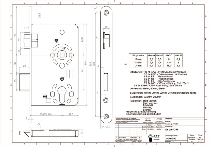 SSF, Objekttür-Objekt-Einsteckschloss, Lochung: WC gelocht, Dornmaß: 65 mm, Entfernung: 78 mm, Drückernussvierkant: 8 mm, Stulpbreite: 24 mm, Stulplänge: 235 mm, Stulpstärke: 3 mm, Stulpausführung: rund, Stulpeigenschaft: beidseitig überstehend, Modellnummer: 24, Wechsel: ohne Wechsel, DIN-Richtung: DIN Rechts, Einzelteilmaterial Stulp: Edelstahl, Farbton Stulp: edelstahl, Oberfläche Stulp: feingeschliffen, Türausprägung: Türe stumpf, Schlossriegel: 1 tourig, Riegelausschluss: 10 mm, Riegeleigenschaft: Standard, Einzelteilmaterial Riegel: Stahl, Oberfläche Riegel: verzinkt, Schlossklasse: Klasse 4, Einzelteilmaterial Drückernuss: Stahl, Drückernuss: Klemmnuss, 3-teilig, Einzelteilmaterial Falle: Stahl, Oberfläche Falle: verzinkt, Falleneigenschaft: mit Flüsterfalle, Einzelteilmaterial Schlosskasten: Stahl, Oberfläche Schlosskasten: verzinkt, Schlosskasten: geschlossen, Schlosskastenlänge: 165 mm, Schlosskastenbreite: 94,5 mm, Schlosskastenstärke: 15 mm, Ergänzung: mit Stahl-Lagerschale, Funktion: Normalfunktion, Türart: Abschlusstür, Innentüren, Türflügelanzahl: einflügelig, Türwerkstoff: Holz, Kunststoff, Aluminium, Norm: DIN 18251-1, DIN EN 12209, Qualitätsbezeichnung: Made in Germany