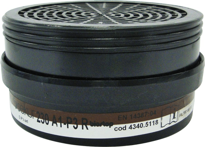 Kombinationsfilter »230« A1-P3R DEigenschaften: • Schutz gegen organische Gase und Dämpfe mit einem Siedepunkt von über 65 °C • Schutz gegen Partikel giftiger und hochgiftiger Stoffe (P3) • Mit inn
