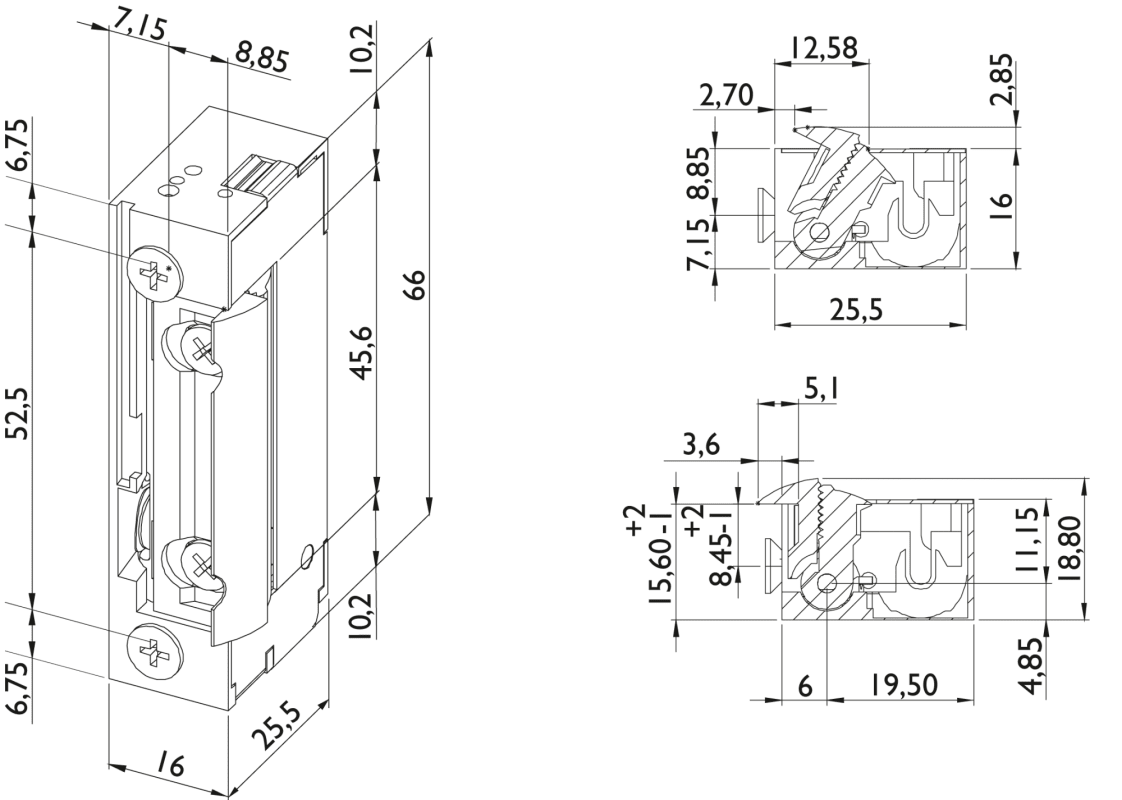 Elektrischer Türöffner DORCAS 99 ND U2 FLEX, Symmetrisch mit ausgeklinktem Fallenteil U2, Regelbares Fallenstück (FLEX) radial öffnend, manuelle Entriegelung, 43 Ohm / 10 - 24 V
