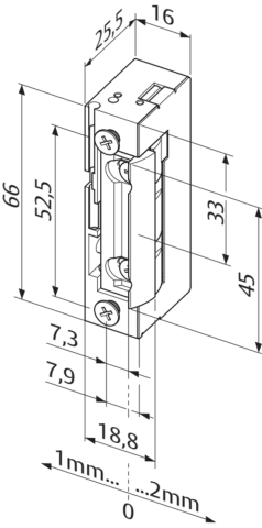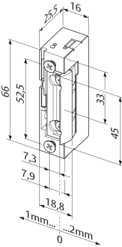effeff Elektro-Türöffner 118.500; Bauform: symmetrisch; Einbaulage: senkrecht,waagerecht; Befestigungsart: zum Einlassen; Entriegelung: ohne; Norm: DIN EN 14846; Einsatzbereich: Türrahmen; Basis: Elek